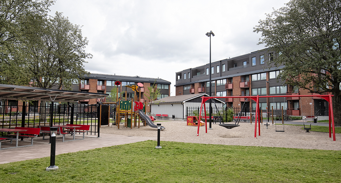 I kvarteret Låtsasskogen bor du bra med barn i nyrenoverade bostäder i grön och barnvänlig utemiljö.